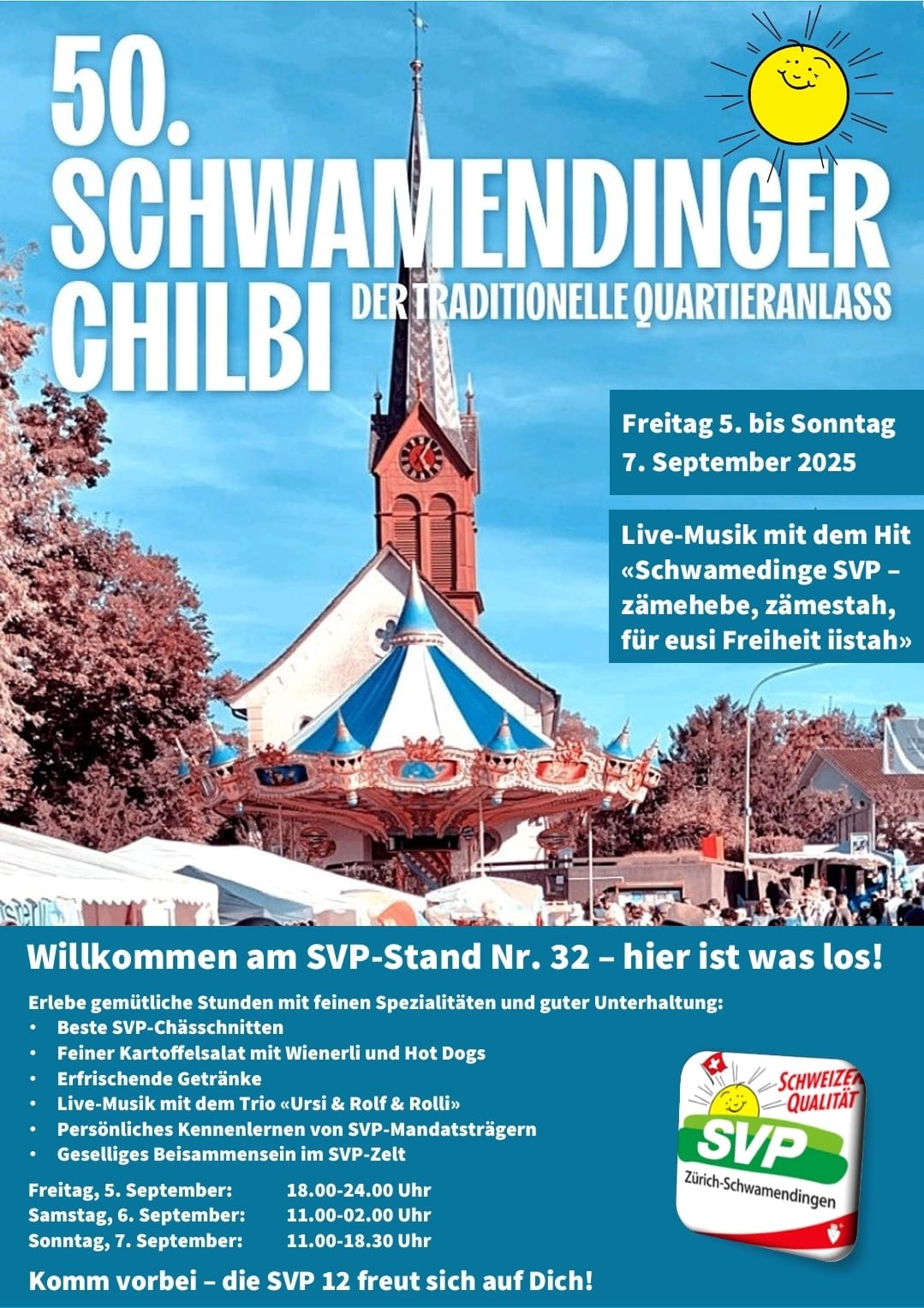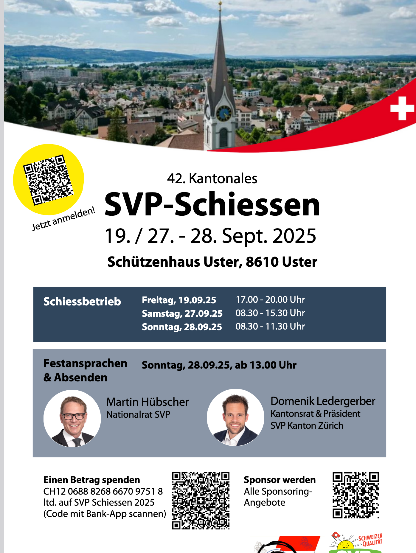 https://www.svp-zuerich.ch/kampagne/svp-schiessen/ Die SVP des Kantons Zürich lädt zum traditionellen SVP schiessen ein. Das Vorschiessen findet am 19. September statt. Das SVP Schiessen findet dann am 27./28. September in Uster statt.