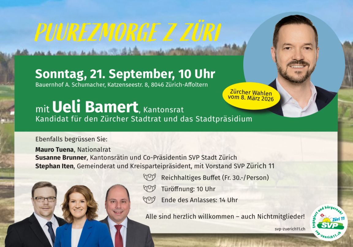 Unser traditioneller Puurezmorge dieses Mal mit Ueli Bamert, Kantonsrat und Kandidat für den Zürcher Stadtrat und das Stadtpräsidium. Ebenfalls begrüssen Sie Mauro Tuena, Nationalrat Susanne Brunner, Kantonsrätin und C0-Präsidentin der SVP Stadt Zürich Stephan Iten, Gemeinderat und Kreisparteipräsident Kreis 11, mit Vorstand Kreis 11.